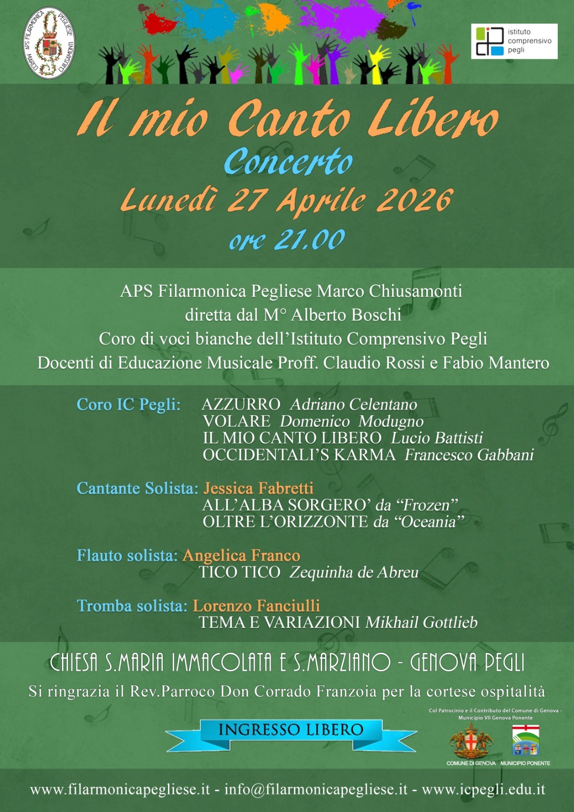 La APS Filarmonica Pegliese Marco Chiusamonti e il Coro dell'Istituto Comprensivo di Pegli vi aspettano con un programma musicale emozionante.