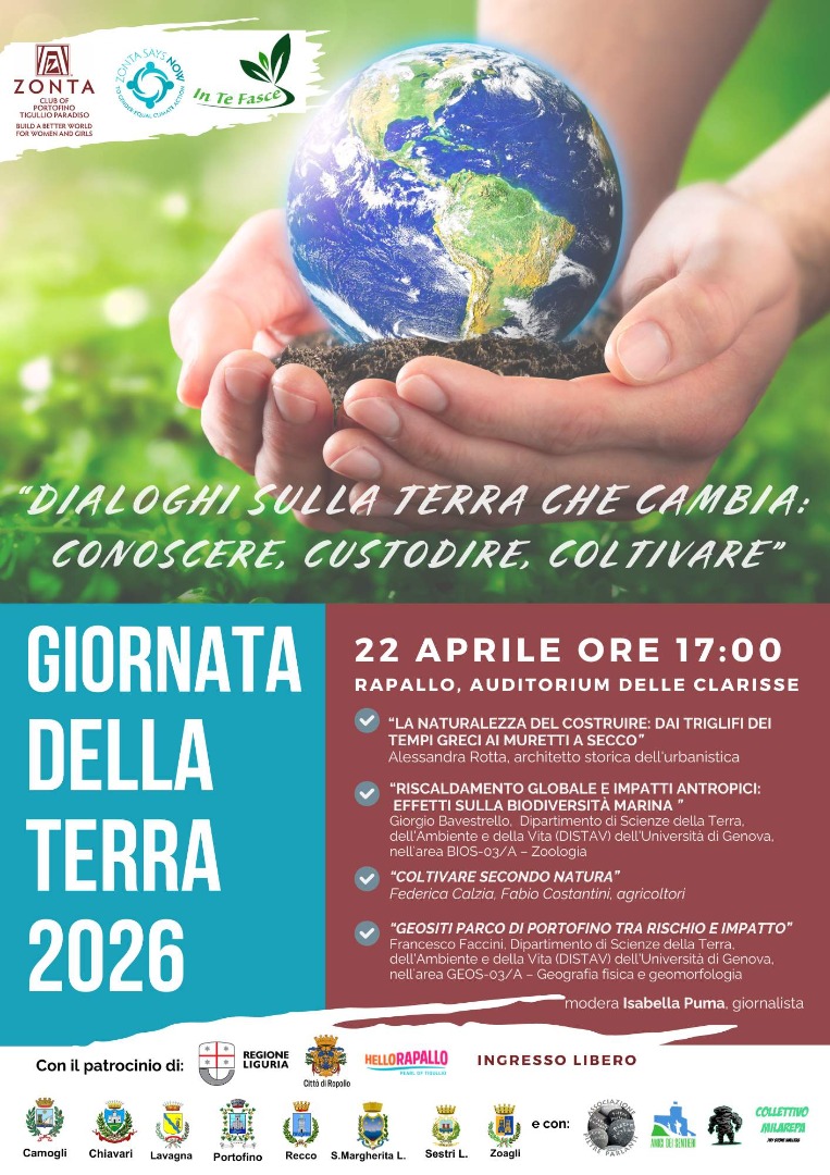 Incontro pormosso in occasione della Giornata Mondiale della Terra 2026 dall'Associazione di Promozione Sociale In Te Fasce, insieme allo Zonta Club Portofino Tigullio Paradiso. L’iniziativa nasce dal desiderio di offrire alla comunità un momento di riflessione condivisa sul rapporto tra esseri umani e ambiente, attraverso contributi scientifici, culturali e testimonianze pratiche.