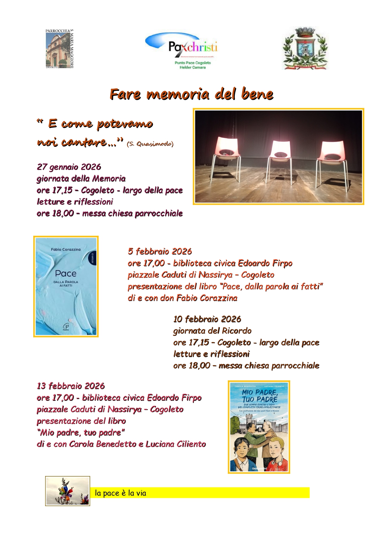 L’associazione Pax Christi punto pace Cogoleto APS prosegue il percorso di incontri del ciclo “Fare memoria del bene”, dedicato alla riflessione sulla pace..