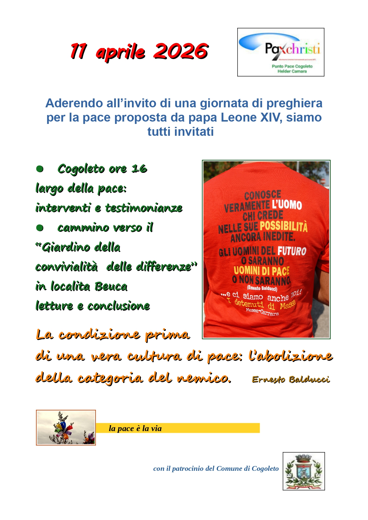 L’evento è promosso da Pax Christi – Punto Pace Cogoleto “Helder Camara”, con il patrocinio del Comune di Cogoleto, e vuole essere un’occasione di condivisione aperta a tutta la cittadinanza.