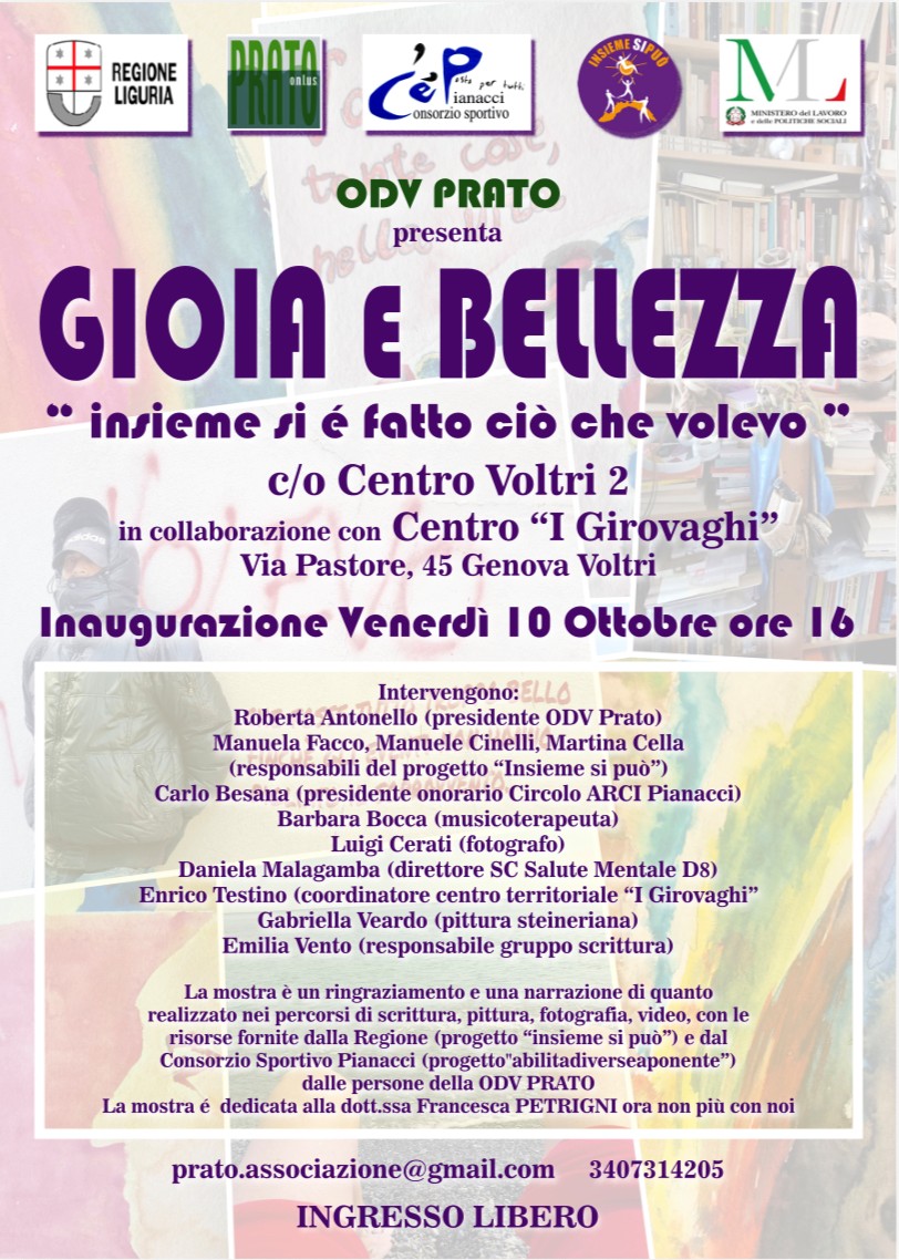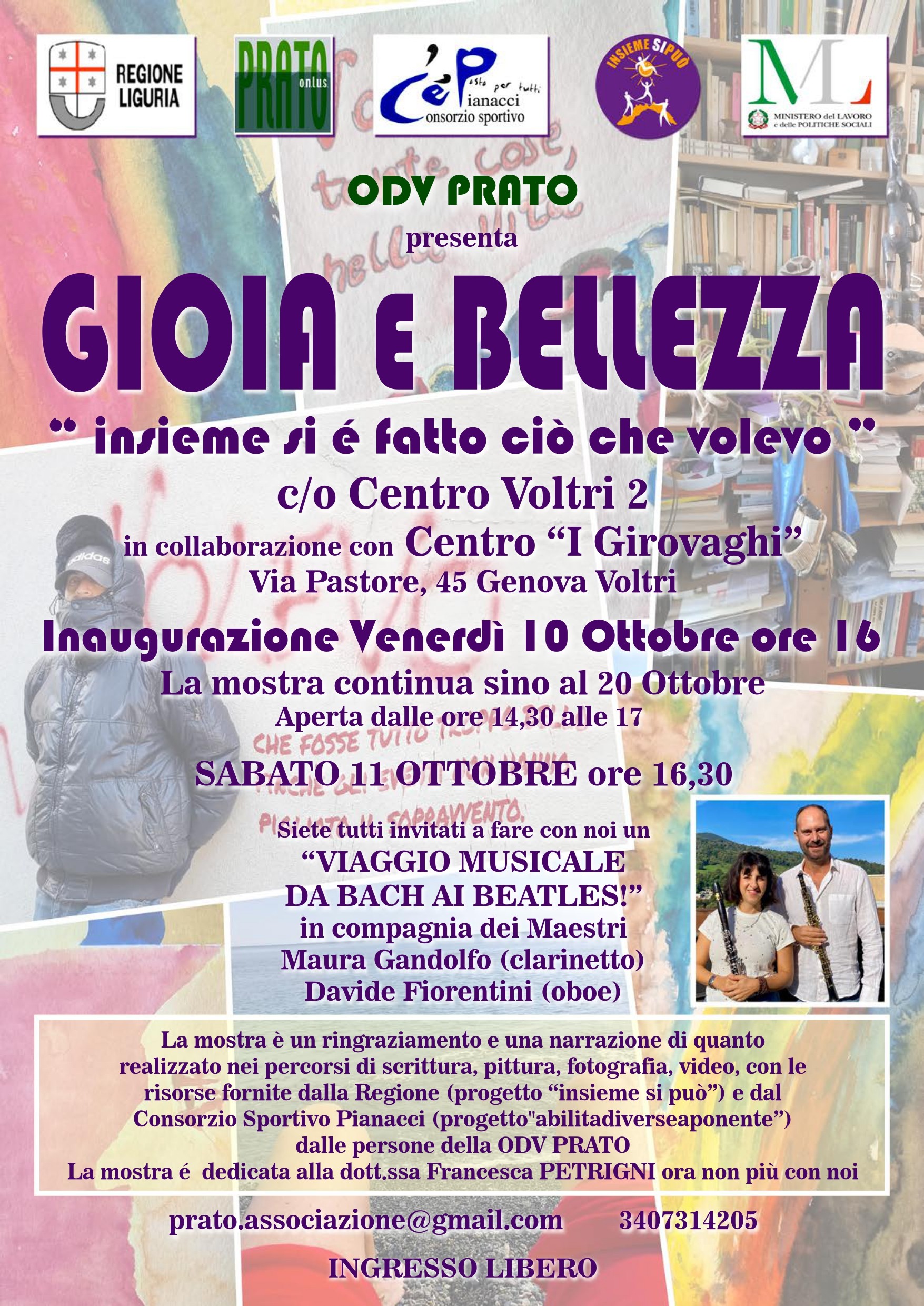 L’Associazione Prato ODV è lieta di invitare all’inaugurazione della mostra “Gioia e Bellezza – Insieme si è fatto ciò che volevo”, che si terrà venerdì 10 ottobre 2025 alle ore 16:00 presso il Centro Voltri 2, in via Pastore 45 a Genova Voltri.