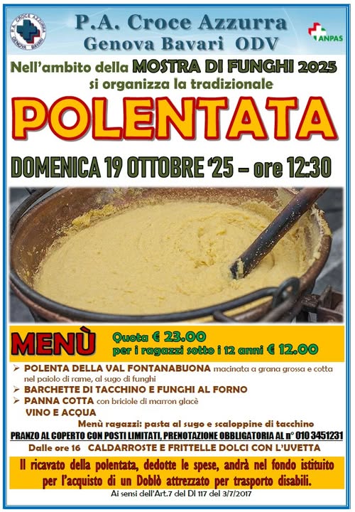 La Pubblica Assistenza Croce Azzurra Genova Bavari ODV, in occasione della Mostra dei Funghi 2025, organizza una polentata domenica 19 ottobre 2025 alle ore 12:30. Il pranzo si terrà al coperto e i posti sono limitati. È obbligatoria la prenotazione al numero 010 3451231.