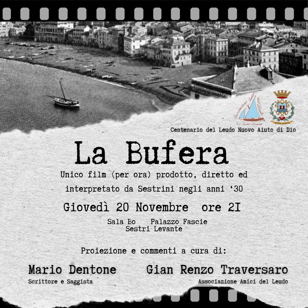 Giovedì 20 novembre 2025 alle ore 21:00, presso Palazzo Fascie – Sala Bo a Sestri Levante, si terrà la proiezione del film “La Bufera”, per ora unica pellicola prodotta, diretta e interpretata da sestrini negli anni ’30.