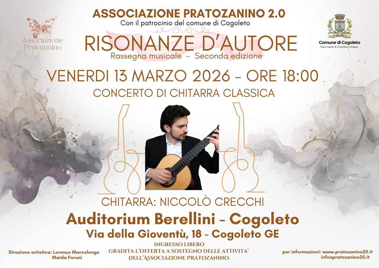 Venerdì 13 marzo 2026 ore 18:00, all’Auditorium Berellini, il chitarrista Niccolò Crecchi guiderà il pubblico in un viaggio nel repertorio della chitarra classica.